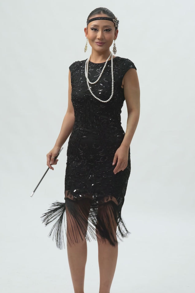Sparkly Black Sequin Spaghetti Straps Bodycon Short 1920s Dress with Fringes