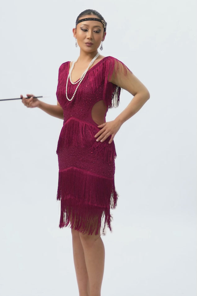 Sparkly Burgundy Bodycon Sequins Flapper Dress with Fringes