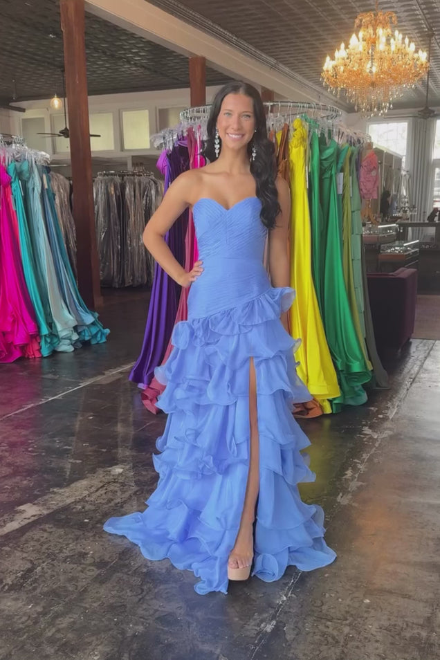Blue Sweetheart A Line Tiered Ruffled Maxi Prom Dress with Slit