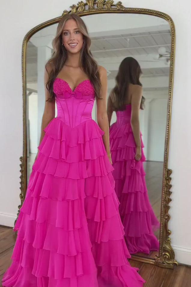 Fuchsia Tiered A Line Strapless Long Corset Prom Dress with Slit