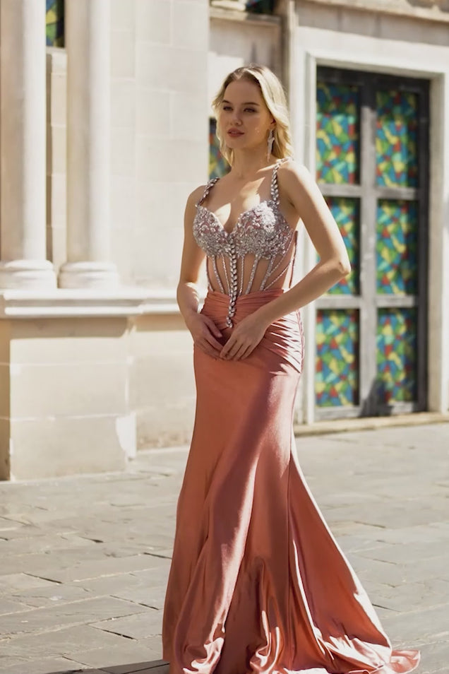 Sparkly Blush Mermaid Spaghetti Straps Satin Long Corset Prom Dress with Beading