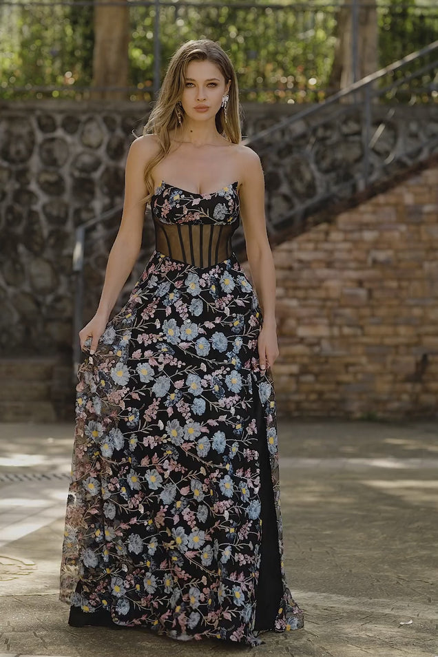 Black Floral A-Line Strapless Long Corset Prom Dress