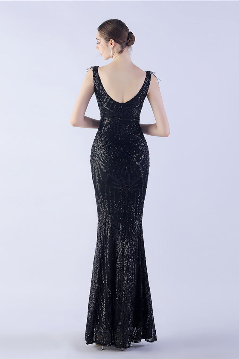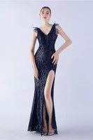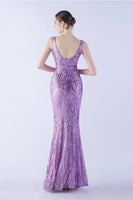 Lilac Mermaid V Neck Side Slit Beaded Evening Dress With Feather