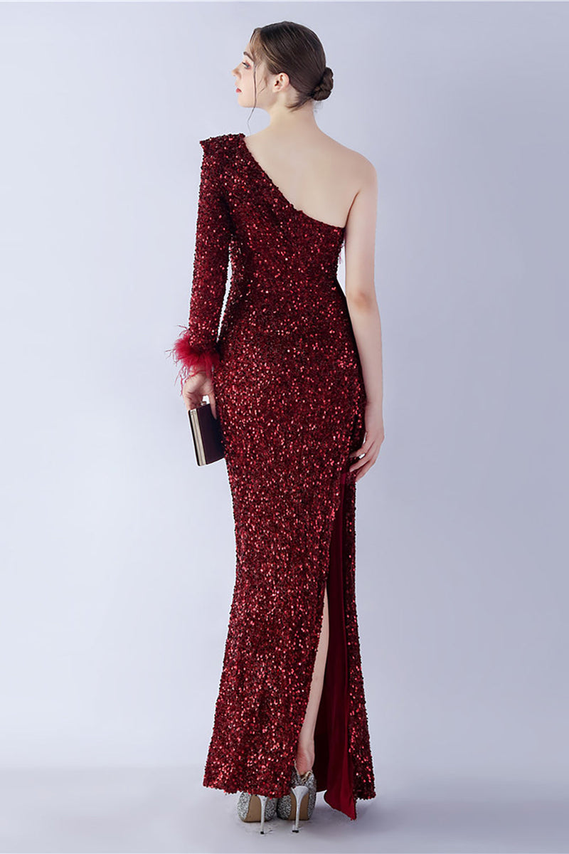 Mermaid One Shoulder Sequin Formal Dress With Feathers