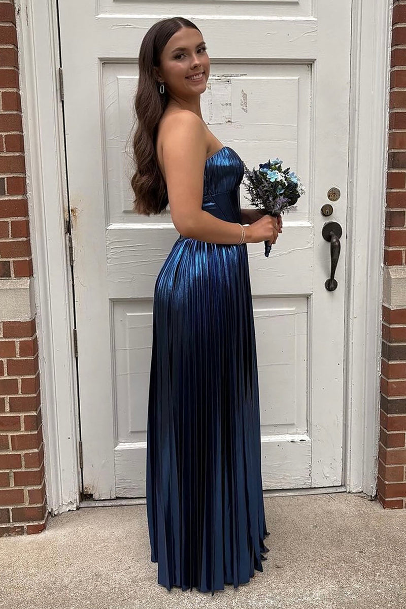 Metallic Navy Sweetheart A Line Corset Pleated Long Prom Dress with Slit