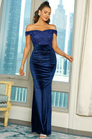 Royal Blue Off the Shoulder Sequin Sheath Long Prom Dress