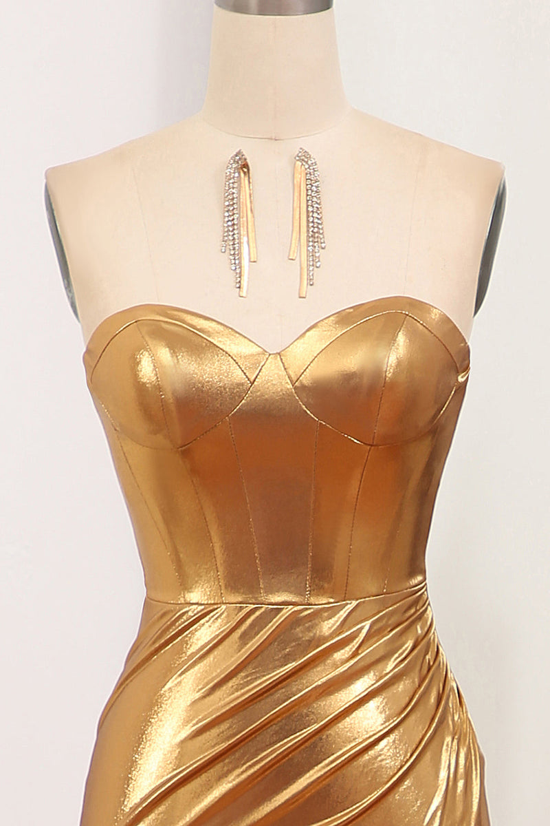 Sparkly Golden Mermaid Strapless Long Prom Dress With Slit