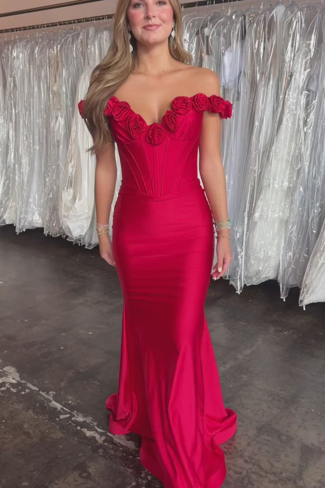 Floral Red Mermaid Satin Off the Shoulder Long Corset Prom Dress