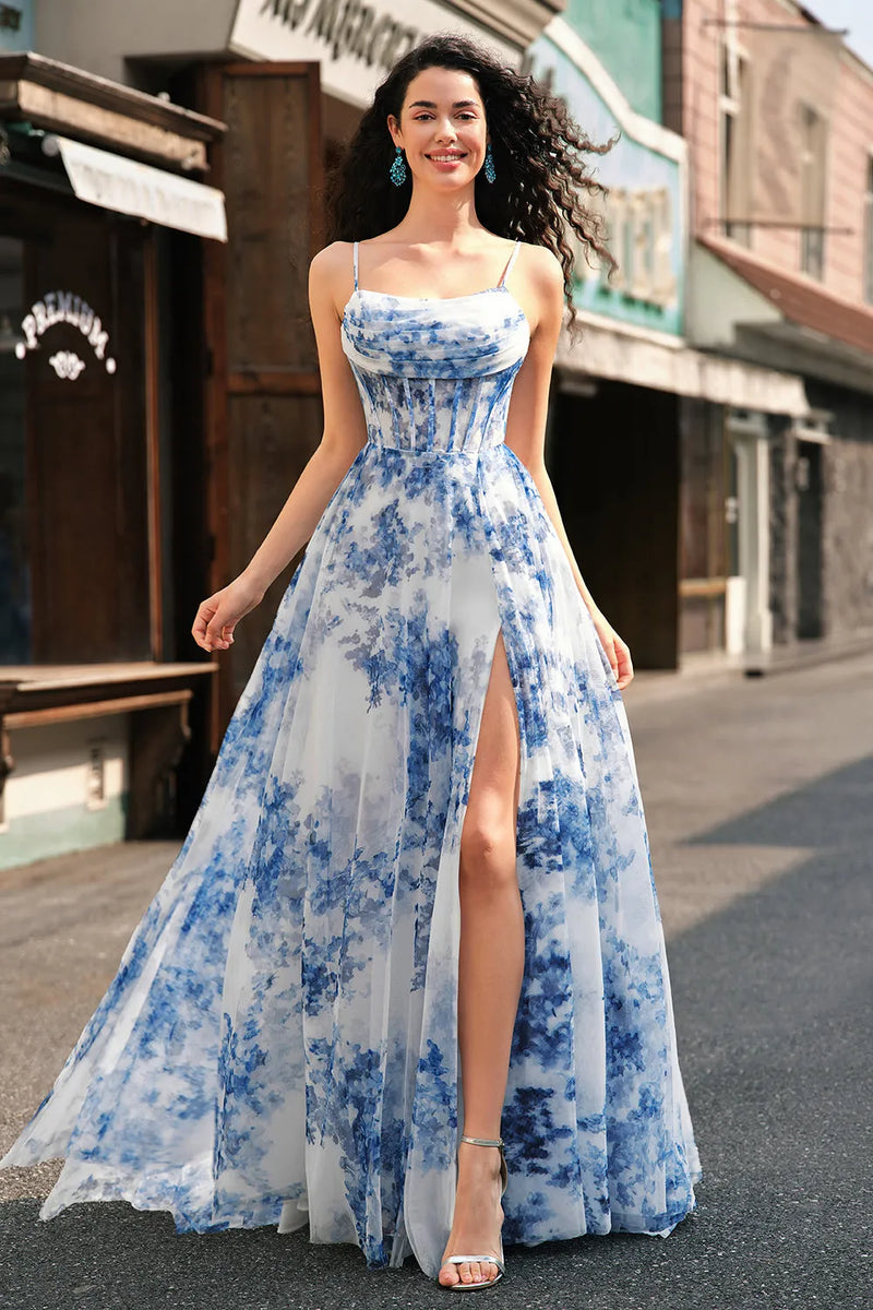 Feature: Radiate charm in this white blue long dress, featuring delicate spaghetti straps and a flowing A line silhouette. The floral pattern adds a soft, romantic touch, while the thigh-high slit brings a modern, elegant edge. Perfect for garden parties, proms, or special occasions.