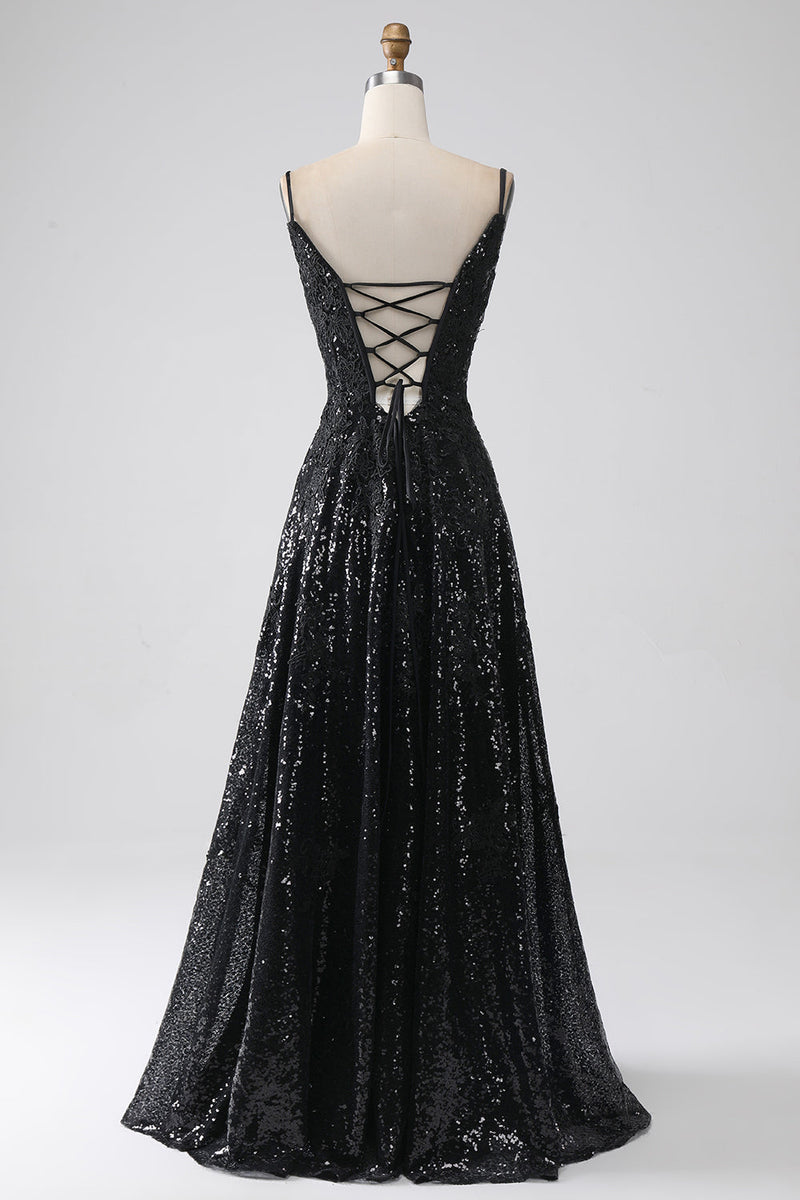 A-Line Cold Shoulder Sequins Long Prom Dress with Slit
