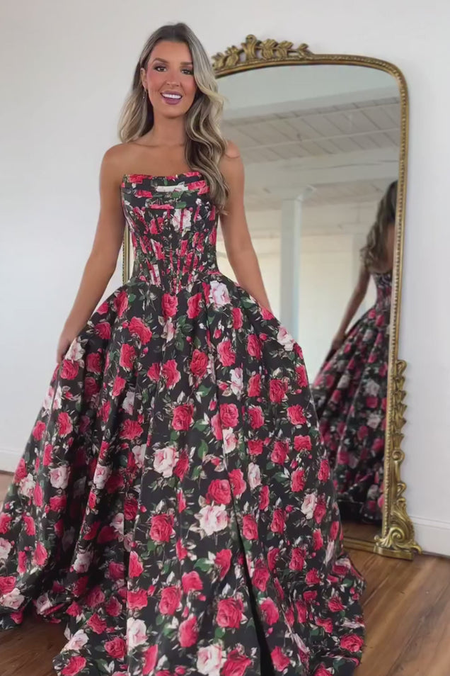 Black and Red A Line Floral Satin Strapless Long Corset Prom Dress with Slit
