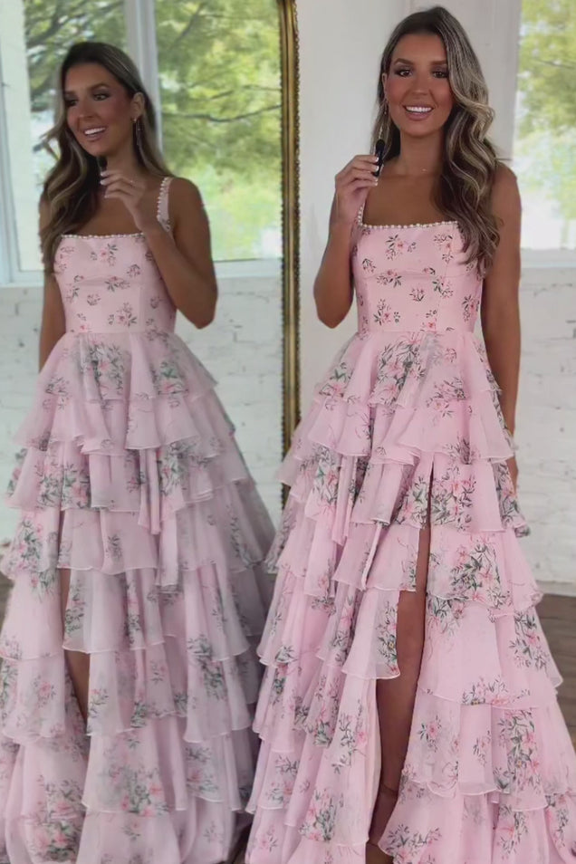 Pink A Line Floral Tiered Spaghetti Straps Long Prom Dress with Slit