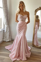 Feature: This elegant mermaid gown features a stunning satin fabric with delicate ruching and pleated details, adorned with subtle appliques for a touch of glamour. The strapless neckline and long silhouette accentuate the figure, while cascading ruffles add movement and romance. Rendered in soft pink, this dress is perfect for making a statement at any formal occasion.