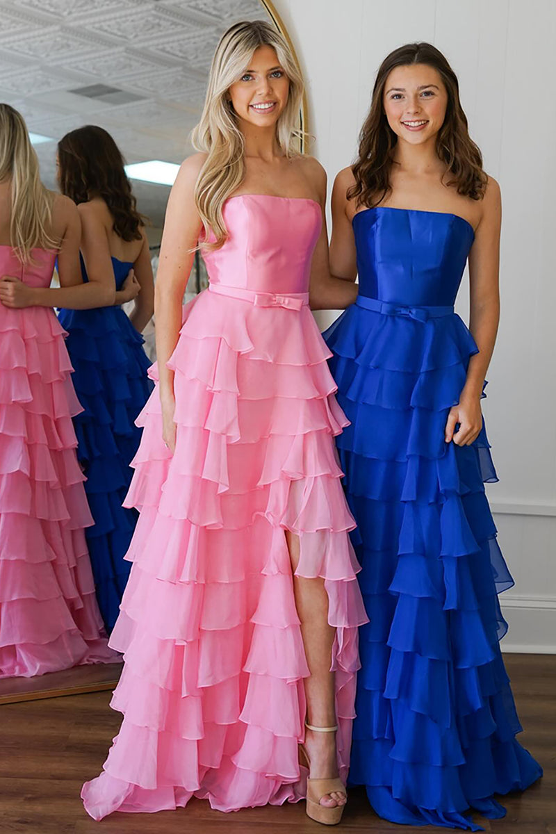 Princess Pink Chiffon A Line Long Prom Dress with Ruffles