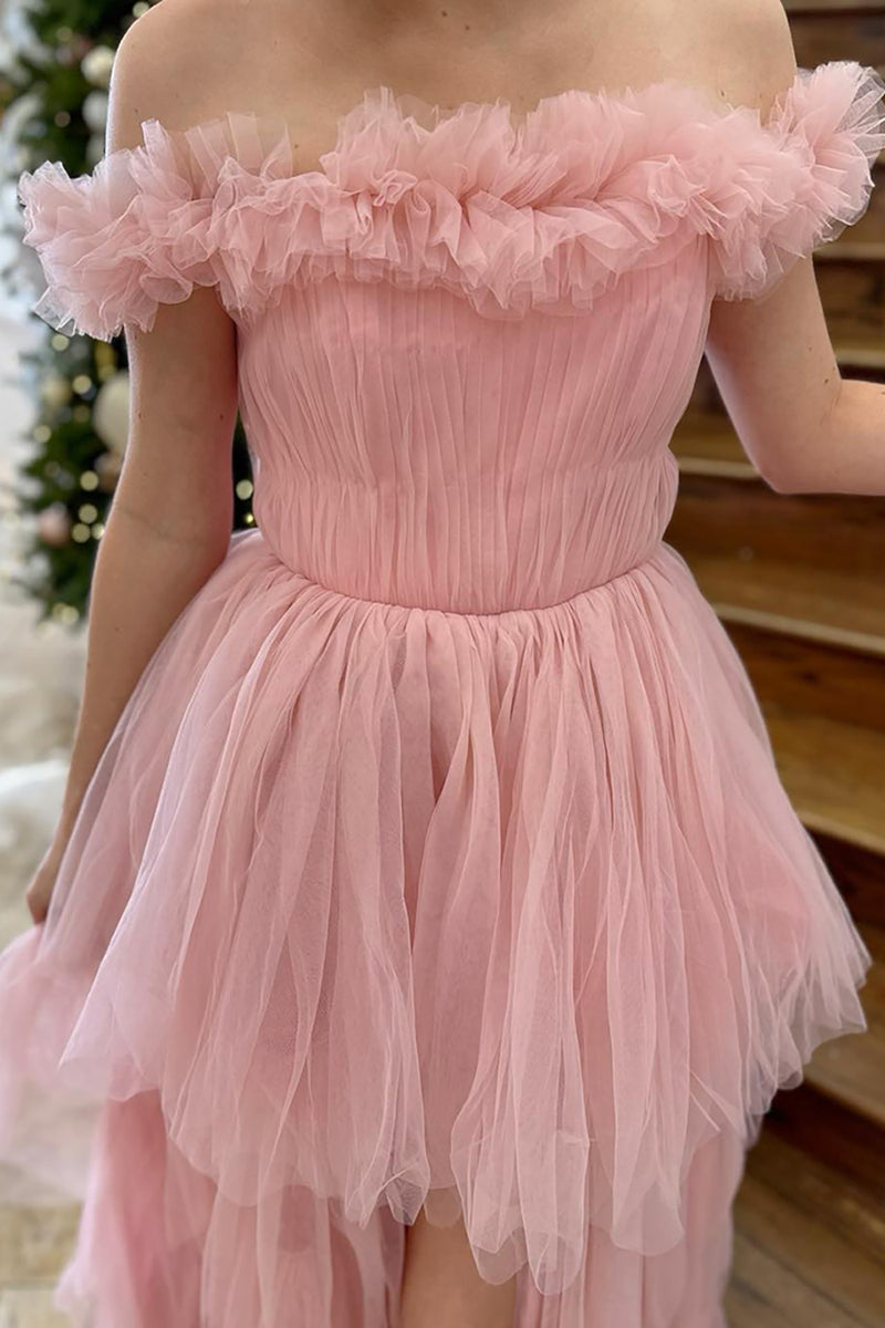 Princess Pink Tulle Ball Gown High Low Prom Dress with Ruffles