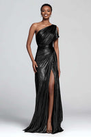 Women Sparkly Brown Mermaid Long Formal Dress with Slit Metallic One Shoulder Holiday Party Dress