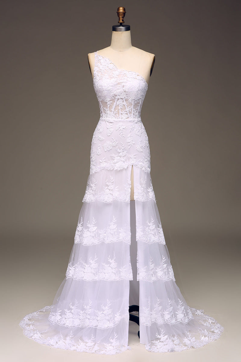 Sparkly Dark Navy Tiered Lace One Shoulder Long Prom Dress with Slit
