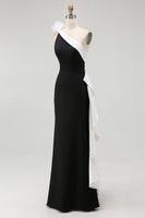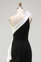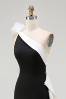 Women White and Black One Shoulder Long Formal Dress with 3D Flowers Sheath Ruffled Graduation Dress