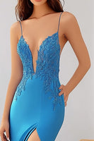 Royal Blue Spaghetti Straps Long Mermaid Prom Dress with Lace