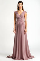 Dusty Rose Chiffon V-Neck Long Ruched Mother of the Bride Dress