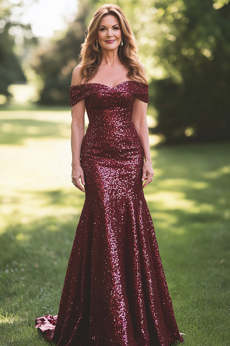 Sparkly Sequin Burgundy Off the Shoulder Mother of the Bride Dress