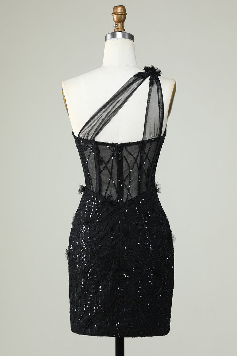 Bodycon One Shoulder Black Corset Short Prom Dress with Appliques