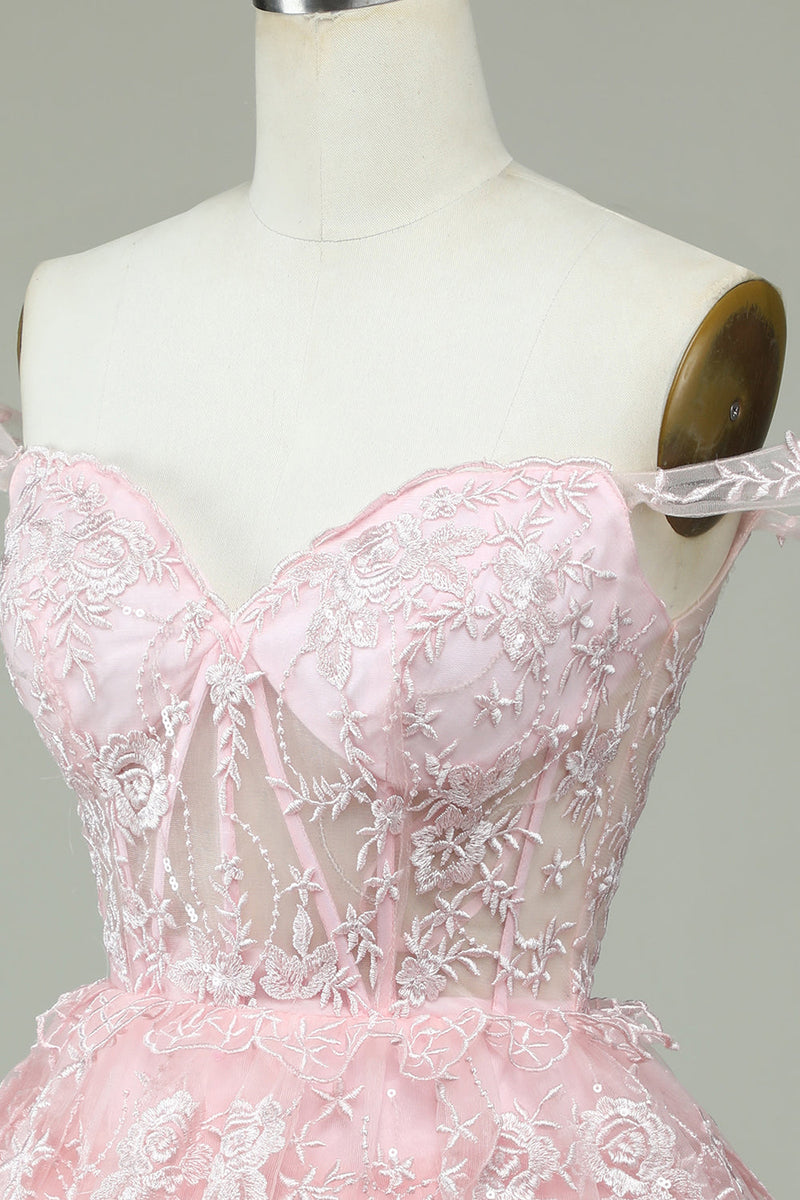 Cute A Line Off the Shoulder Pink Corset Short Prom Dress with Lace