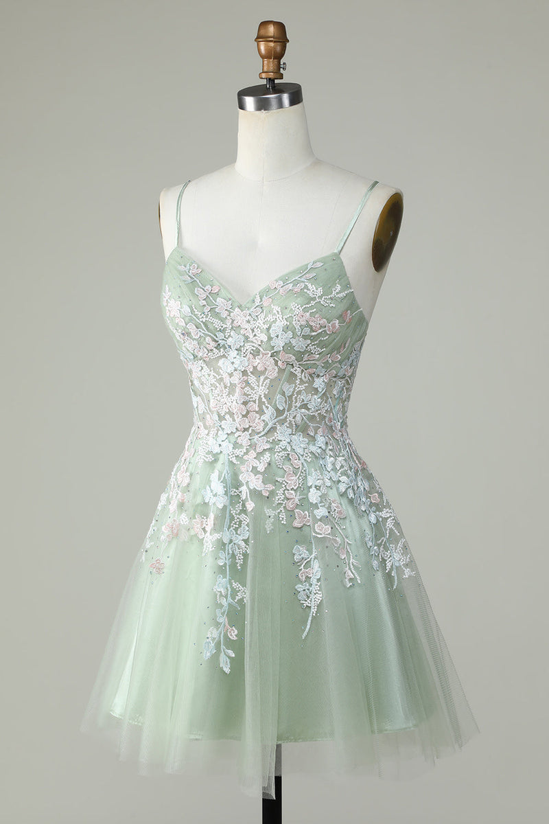 Dusty Sage Spaghetti Straps Short Prom Dress With Criss Cross Back