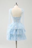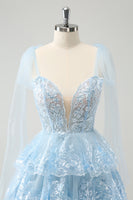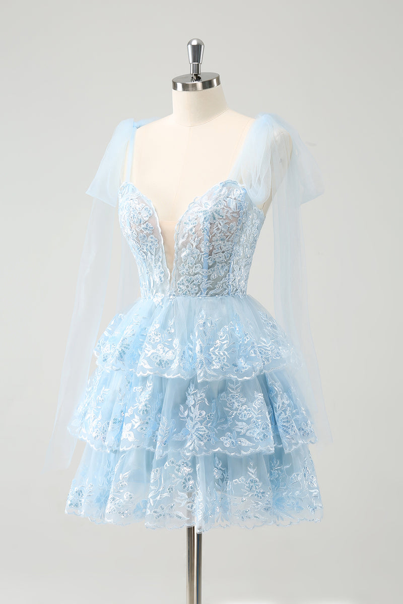 Glitter Blue V Neck A-Line Tiered Embroidery Short Prom Dress