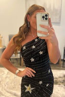 Sheath One Shoulder Black Sequins Short Prom Dress with Star