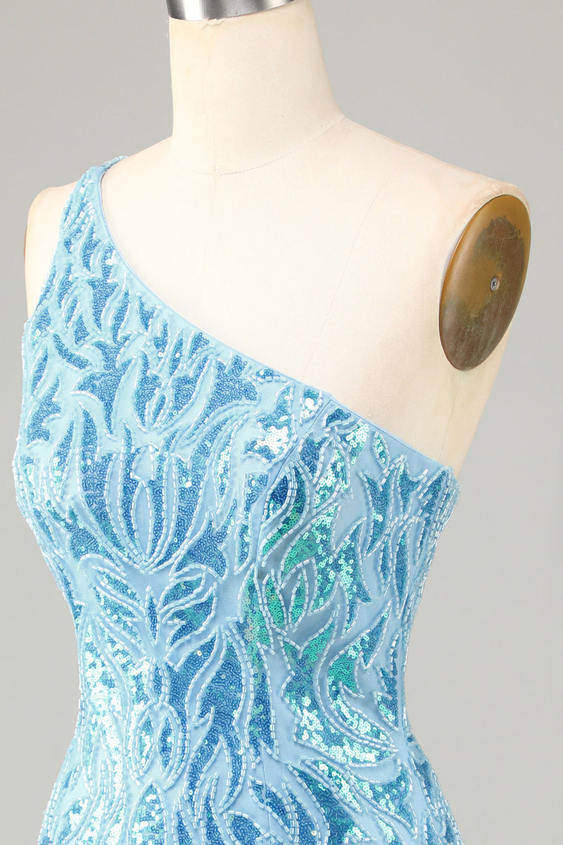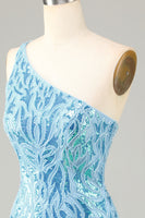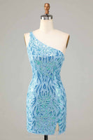 Sheath One Shoulder Blue Sequins Short Party Dress with Tassel