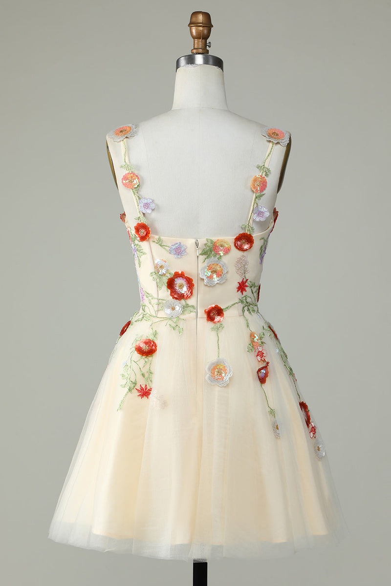 Spaghetti Straps Black A Line Sequin Flowers Short Prom Dress