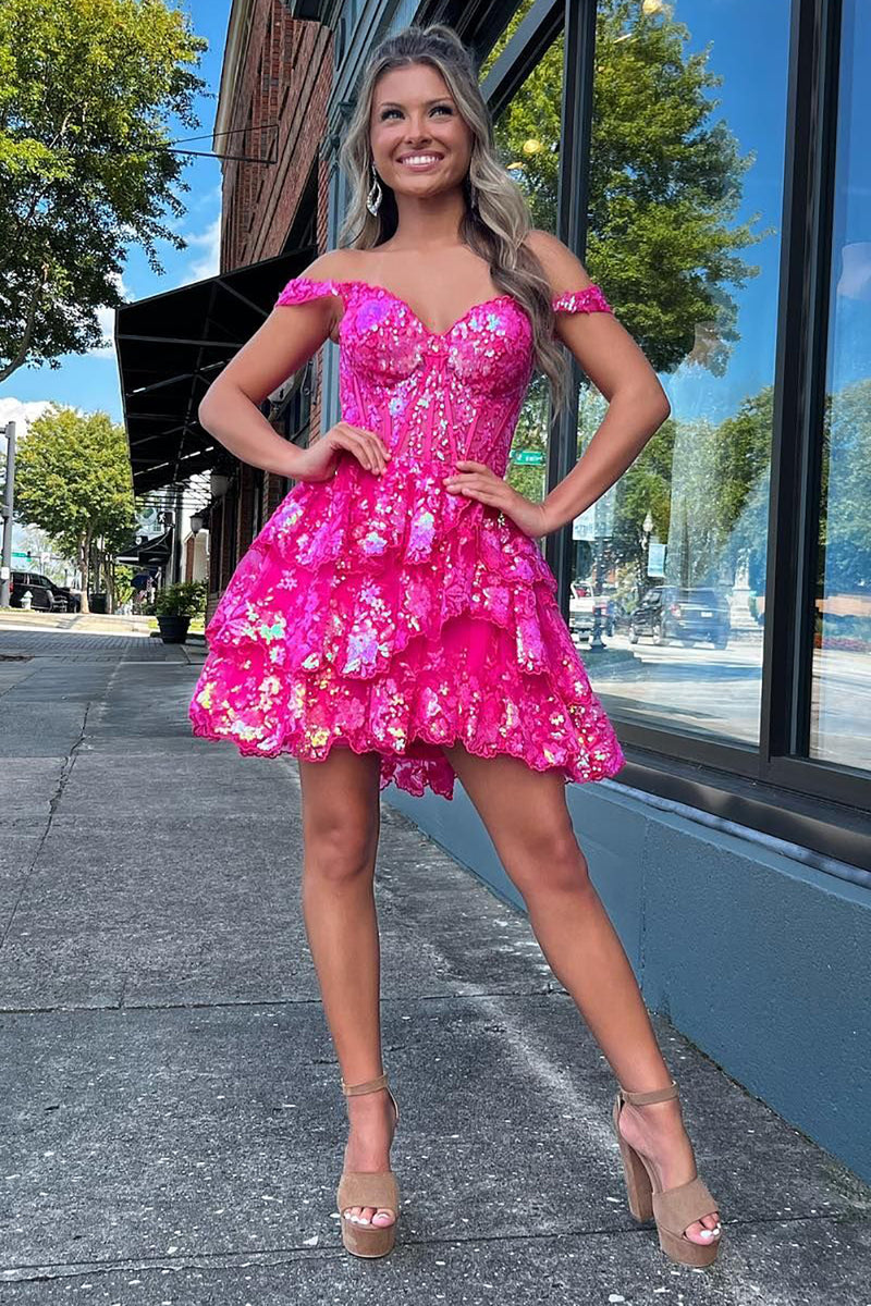 Occasion: This sparkly fuchsia party dress combines an off the shoulder neckline, corset top bodice, and A-line silhouette for a chic and flattering look. The sparkling sequined applique adds a touch of glamour, while tiered ruffles on the dress add texture and movement.