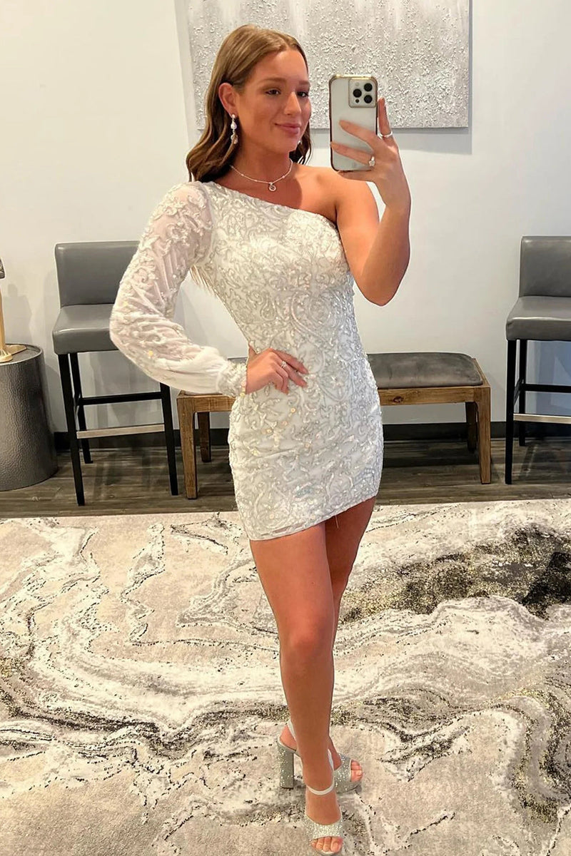 White Beaded Sequins One Shoulder Tight Short Prom Dress