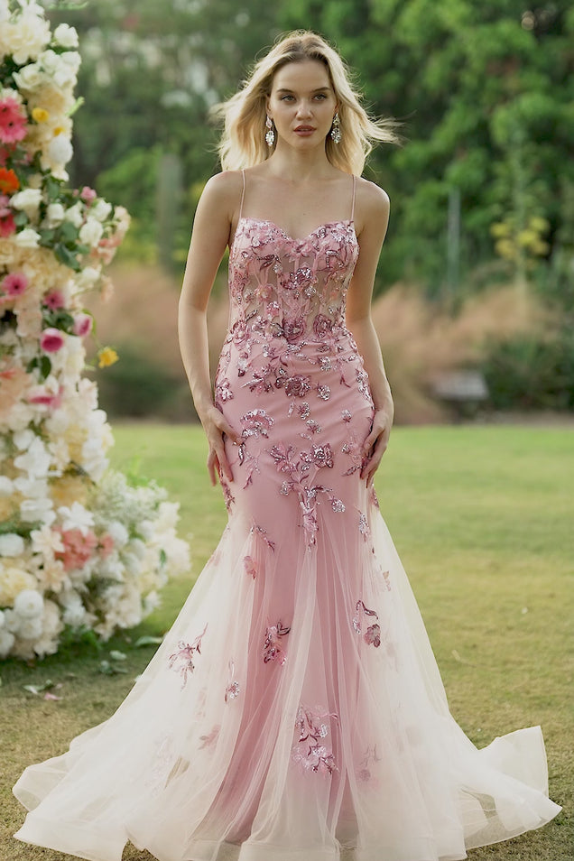 Sparkly Blush Mermaid Floral Long Corset Prom Dress