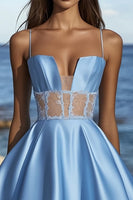 Blue Satin Spaghetti Straps Short Graduation Dress with Lace