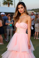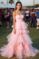 Blush Ball Gown Tiered Backless Long Formal Dress with Beading