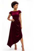 Burgundy Boat Neck A Line Ruched Asymmetrical Holiday Party Dress