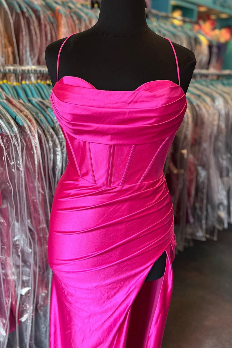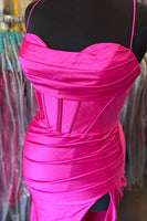 Hot Pink Spaghetti Straps Satin Mermaid Prom Dress with Slit