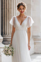 Ivory A Line V-Neck Tulle Floor-Length Wedding Dress with Sleeves