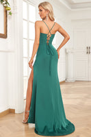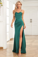 Spaghetti Straps Dark Green Satin Corset Prom Dress with Ruffles