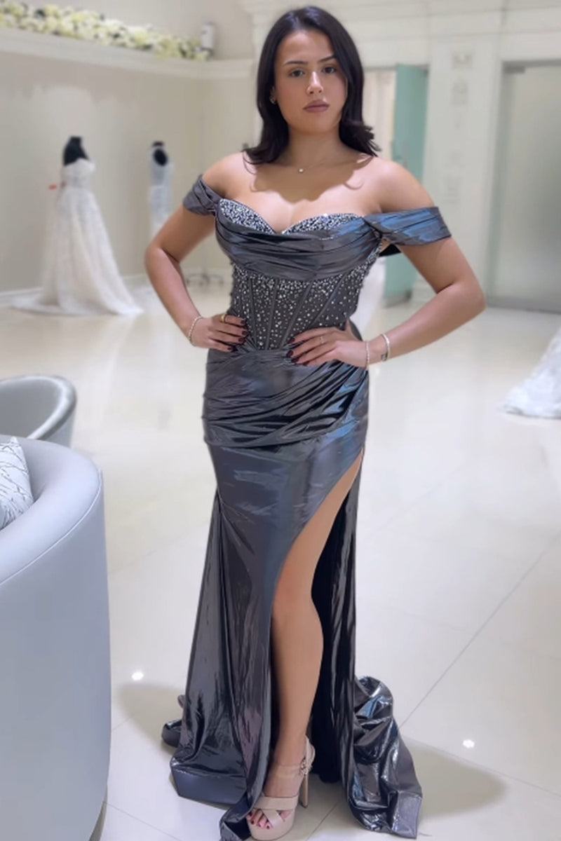 Sparkly Grey Mermaid Off the Shoulder Beaded Corset Ruched Satin Long Prom Dress with Slit