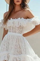 Features: Off-the-shoulder A-line silhouette with high-low hem, delicate ruffle detailing along the skirt, flattering fitted waist, breathable lace fabric, smooth lining for comfort, feminine and flowy design that enhances movement, perfect for capturing attention at any event.