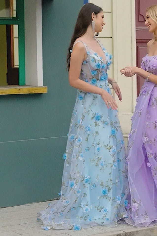 Blue A-Line V-Neck Long Prom Dress with 3D Flowers
